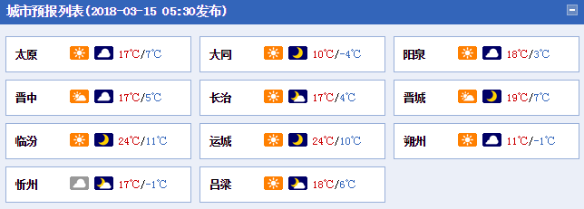 3月15日,木曜日,夏历正月二十八。今天白日:全省多云间好天,有4~5级偏春风,气温较着下降。最高气温:北部及中南部山区10~17℃,中南部其余地域18~24℃。今天夜间:全省多云,南部部门地域有4~5级偏春风,气温继续下降。最低气温:北中部及南部山区-4~-1℃,南部其余地域4~10℃。